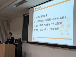 内容は日本一挑戦プロジェクトの展開や労働・雇用の現状等。また将来社会人となる学生にアドバイスもしていただきました。