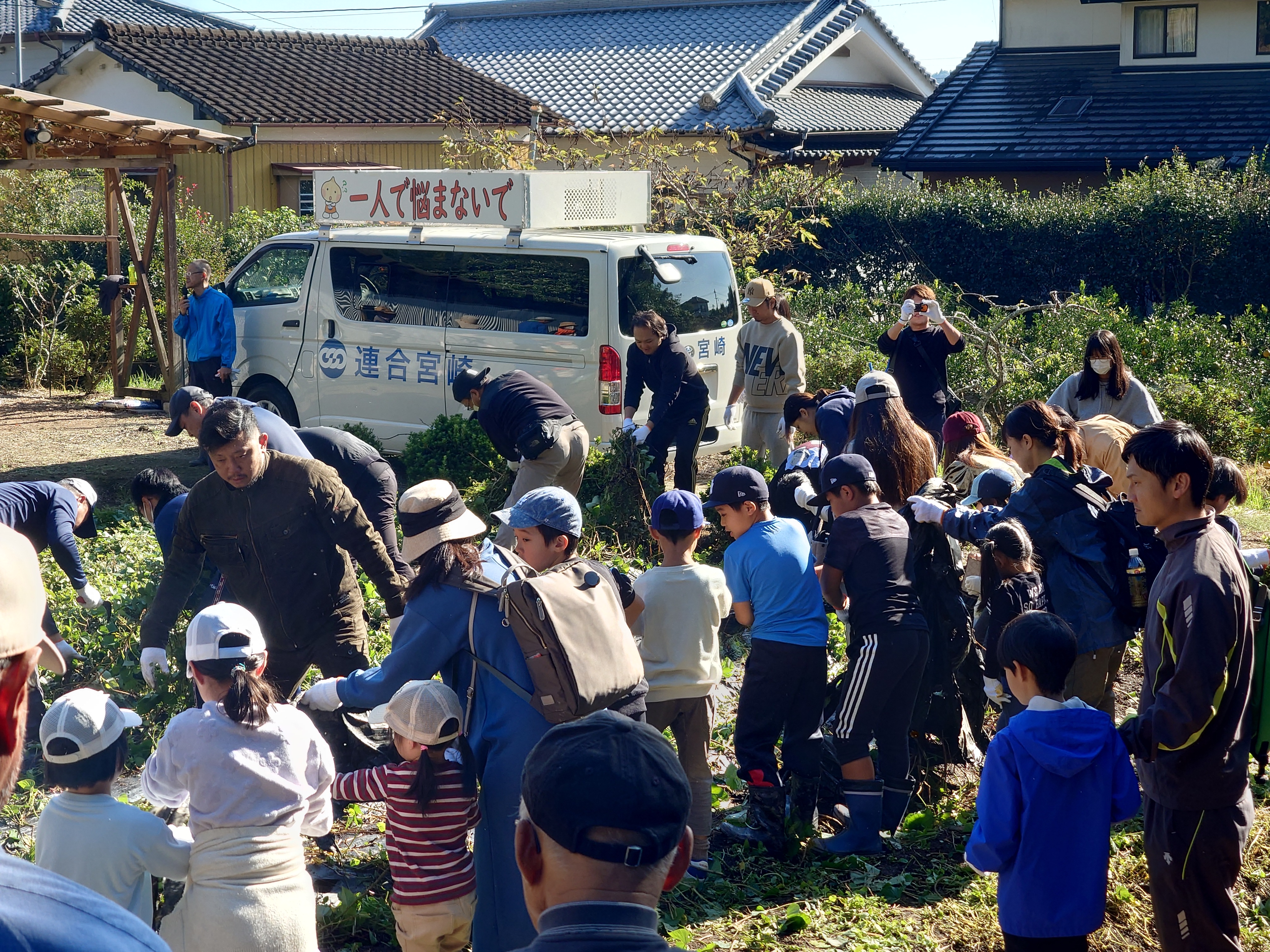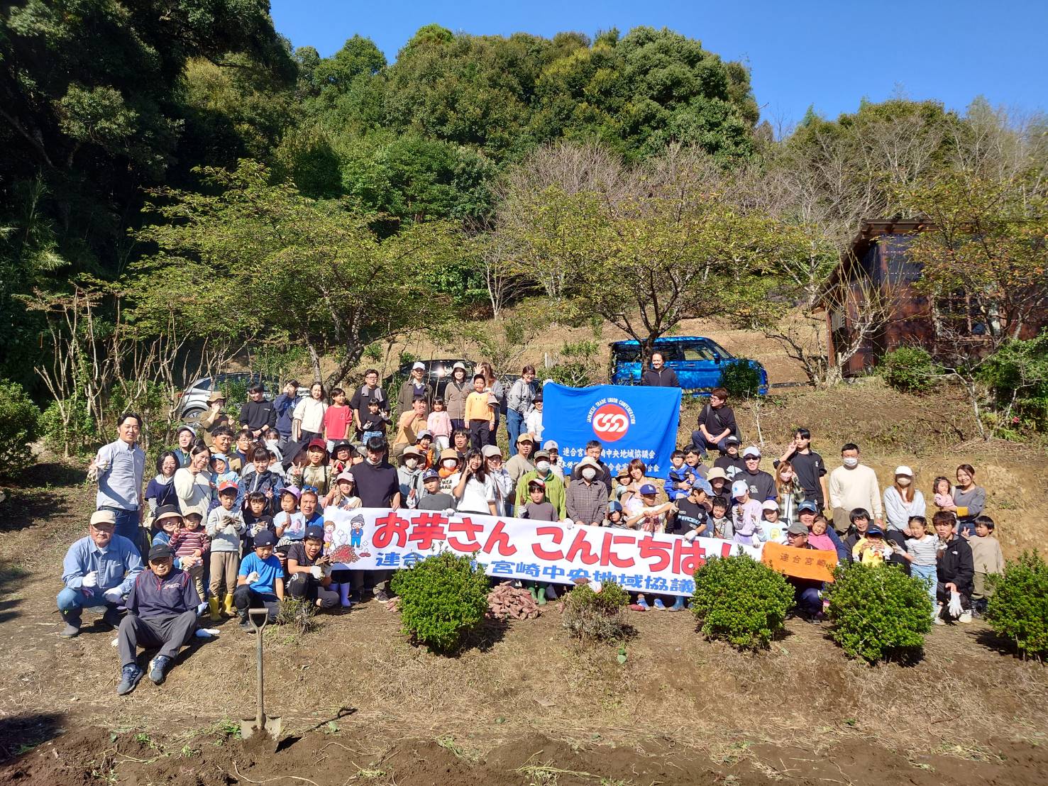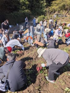 11月15日、中央地域協議会ふれあい農園(高岡町)にて開催し、117名の参加をいただきました。春に苗付け、夏に除草作業をし、本日収穫となりました。