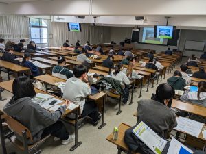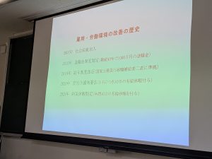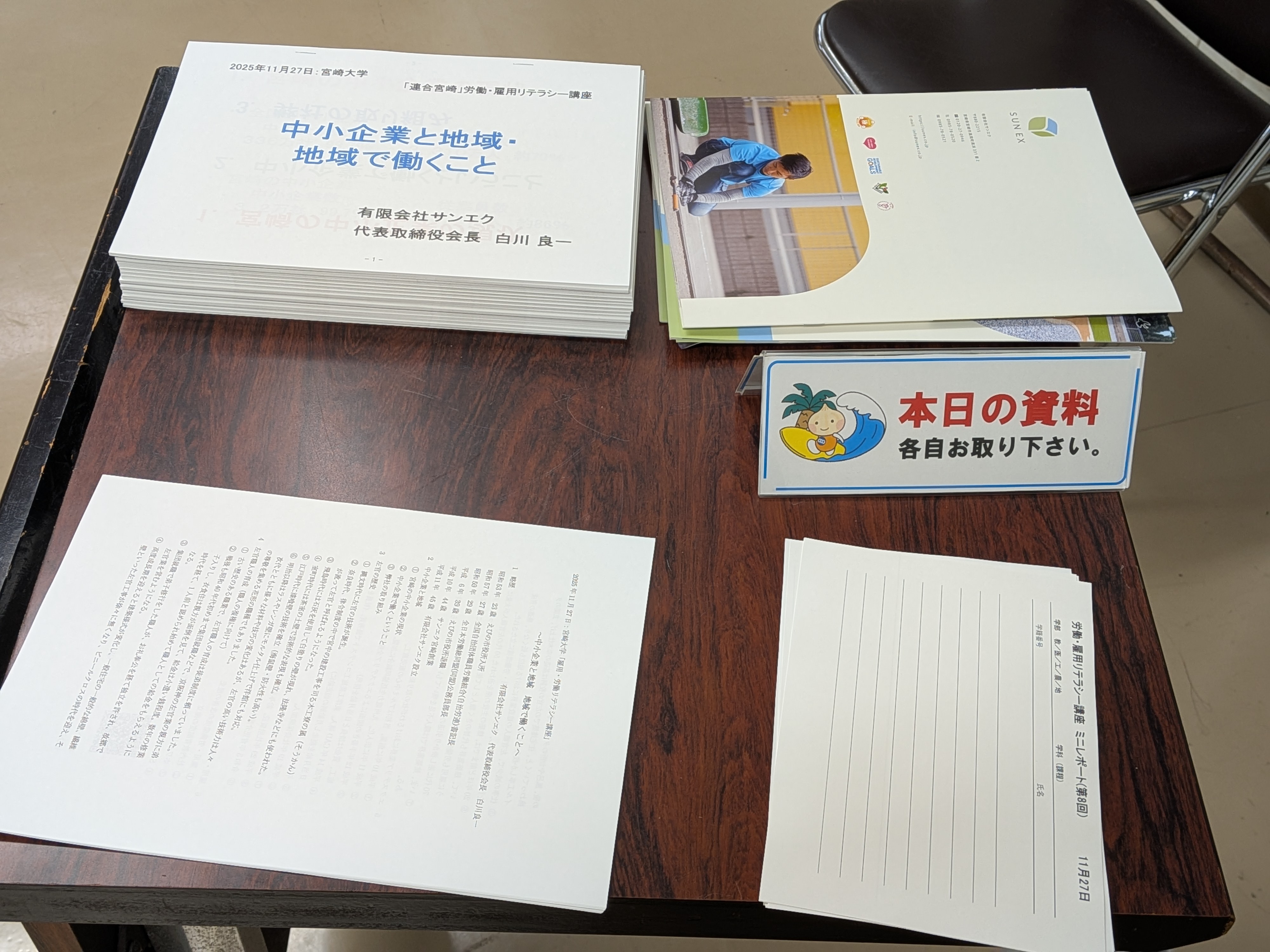 11月27日、宮崎大学において「中小企業と地域・地域で働くこと」と題して、有限会社サンエク 代表取締役会長 白川良一様による講義が行われました。大企業と比べ賃金水準や福利厚生は劣りますが、下記のとおり社員が安心して働ける会社をめざしている取り組みの説明がありました。