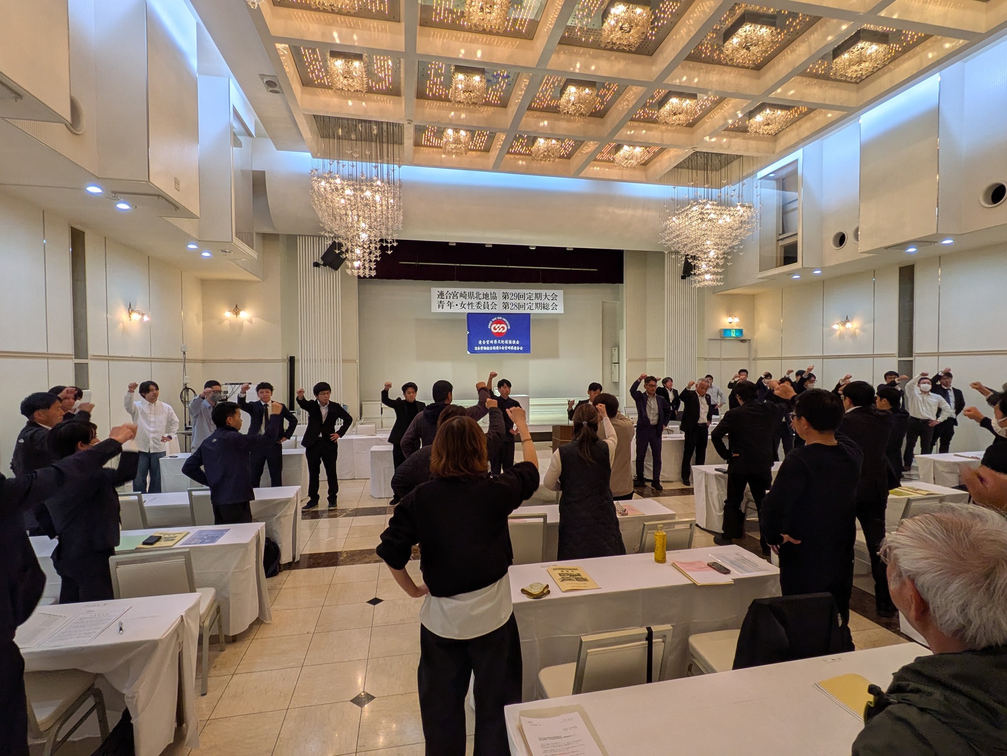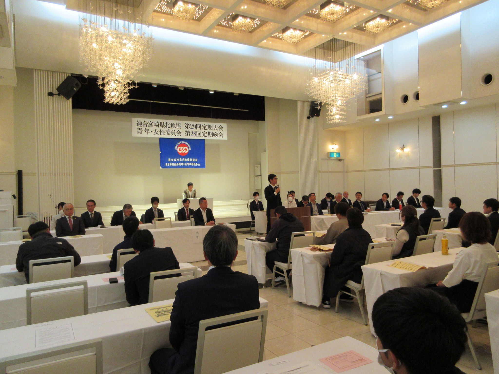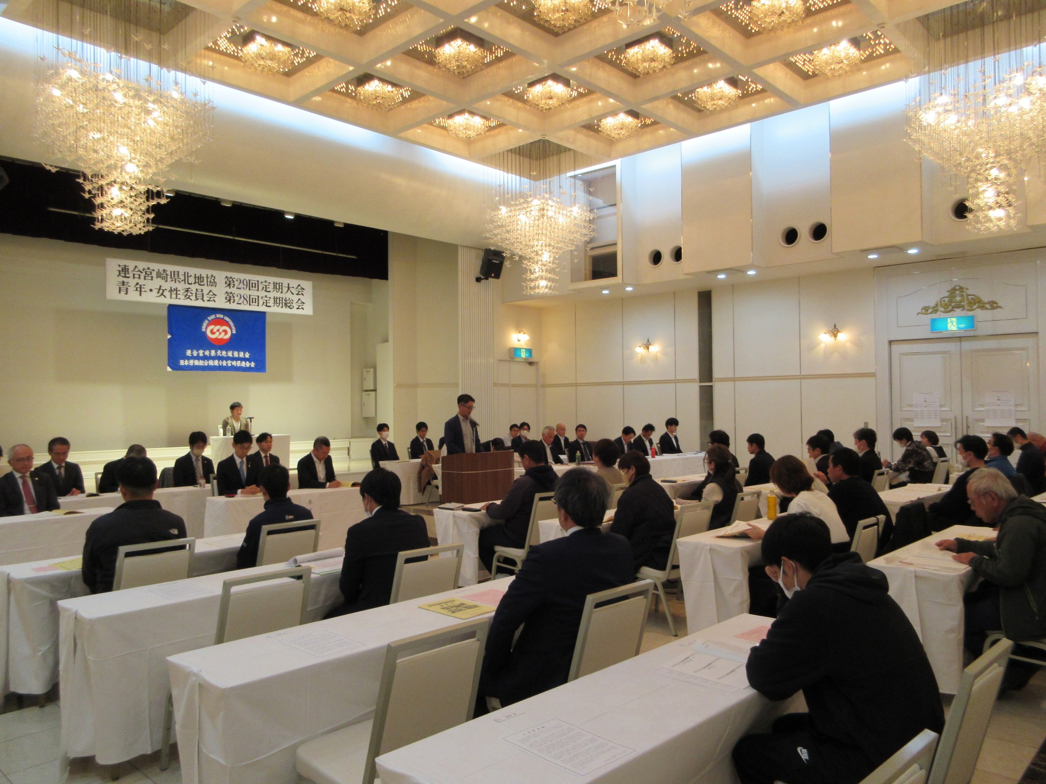 11月28日(金)「ガーデンベルズ延岡」において第29回連合宮崎県北地協定期大会が役員を含め66名の参加者により開催されました。